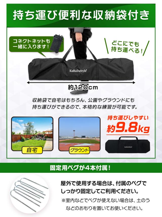 【様々なボールスポーツに】ネットの下からもボールが抜けない安心設計。専用のコネクトネット(別売)を使うことで、無限に連結可能となり、角度をつけて設置することも可能となっております。自宅や河川敷、公園、グランド、どこでも使えます。