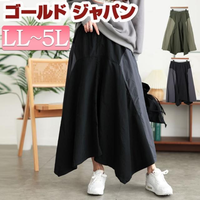 秋新作 大きいサイズ レディース スカート ボトムス バイカラー切り替えイレヘムスカート ロングスカート フレアスカート ロング フレア ウエストゴム バイカラー 配色 イレヘム アシメ 変形 タック 春服 夏服 秋服 冬 LL 2L 3L 4L 5L ブラック 黒 カーキ ゴールドジャパン