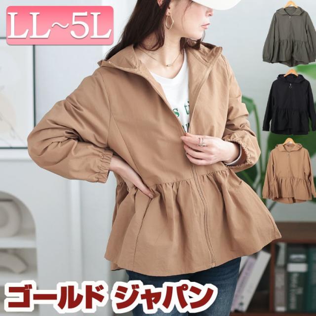秋新作 大きいサイズ レディース アウター ジャケット パーカー ペプラムナイロンマウンテンパーカー マウンテンパーカー マンパ ペプラム ギャザー ポケット ジップ ナイロン フレア 前開き ゆったり 春服 秋 LL 2L 3L 4L 5L ブラック 黒 キャメル グレー ゴールドジャパン