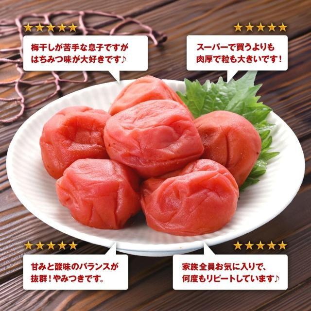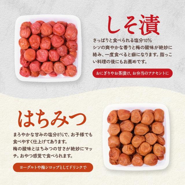 はちみつは塩分8%、しそ漬も塩分10%と控えめでマイルドな味わいに仕上がっています。種も小さいため子供からお年寄りの方まで安心してお召し上がりいただけます。