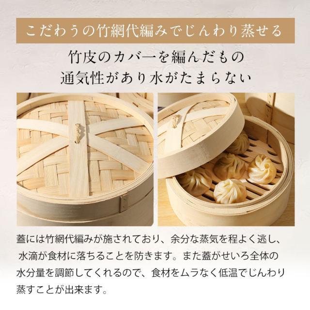 ・蓋には竹網代編みが施されており、余分な蒸気を程よく逃し、水滴が食材に落ちることを防ぎます。また蓋がせいろ全体の水分量を調節してくれるので、食材をムラなく低温でじんわり蒸すことが出来ます。