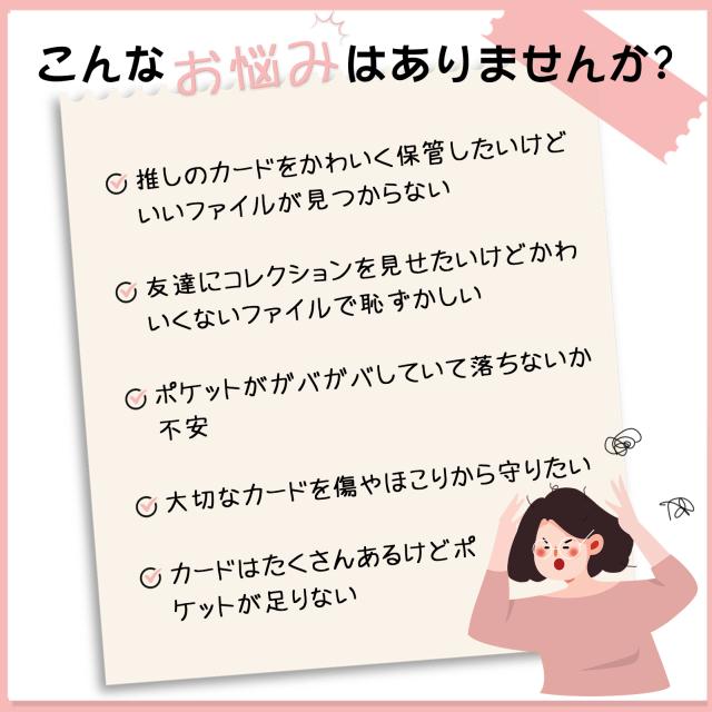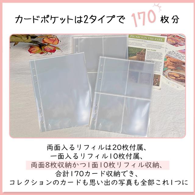 | 【カードポケットは2タイプで170枚分】 | 両面入るリフィルは20枚付属、一面両面入るリフィルは10枚付属。8枚収納ポケットかつ10枚1面収納ポケットでコレクションのカードも思い出の写真も全部これ1つに! |