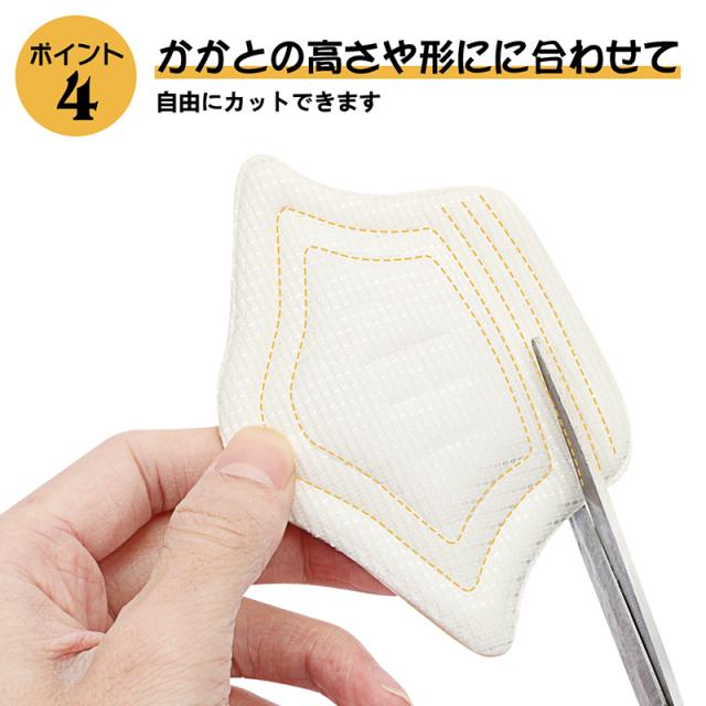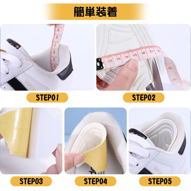 まず、靴の中の汚れを落とし、接着面の剥離シートを剥します。取り付け位置を定め、本品を張りつけています。どんな靴でも快適フィット。履いている時は目立ちにくい。かかとの高さや形にに合わせて、自由にカットできます。 |