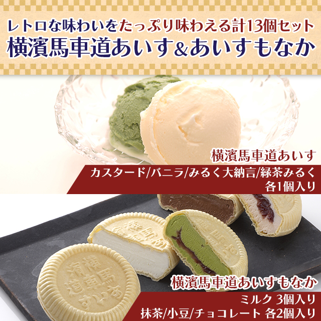 商品名 横濱馬車道あいす&あいすもなか 計13個 TBW4Y 容量 【あいす】カスタード・バニラ・みるく大納言・緑茶みるく各110mL×1個