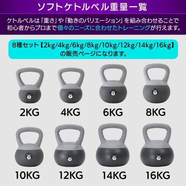 | セット内容 | ソフトケトルベル【2kg/4kg/6kg/8kg/10kg/12kg/14kg/16kg】8種セット |