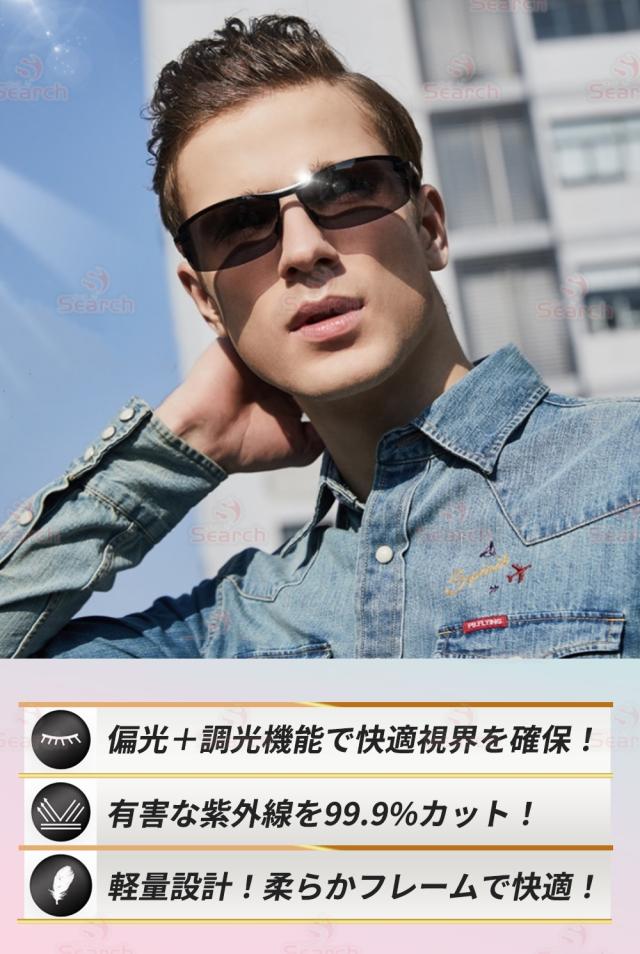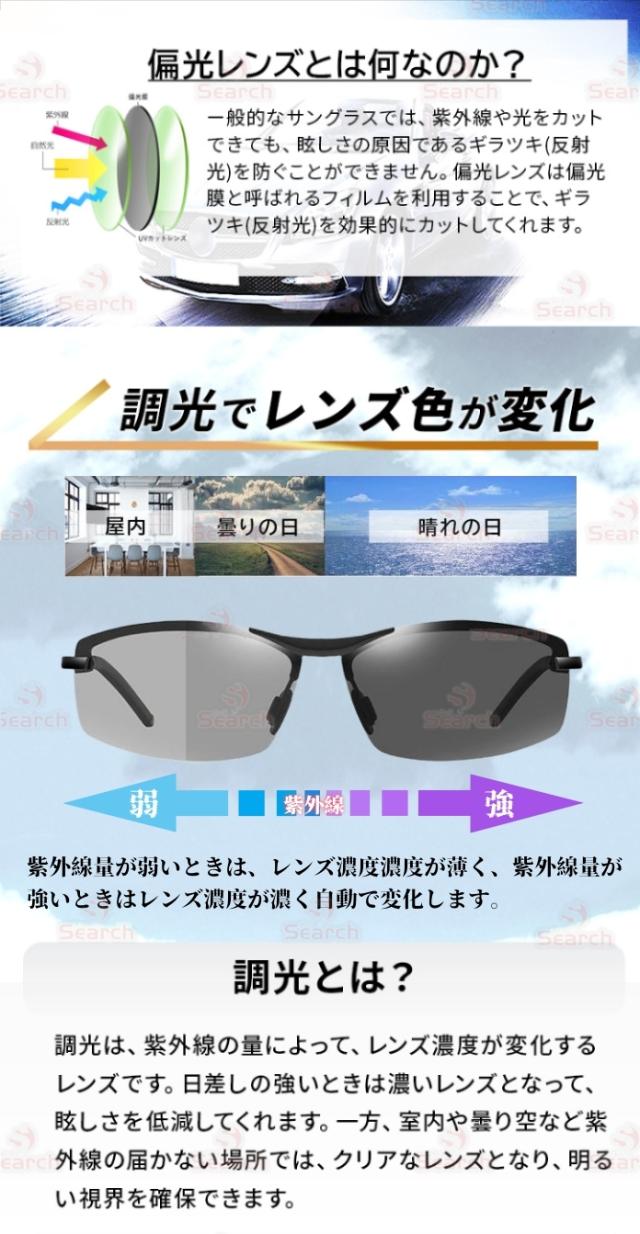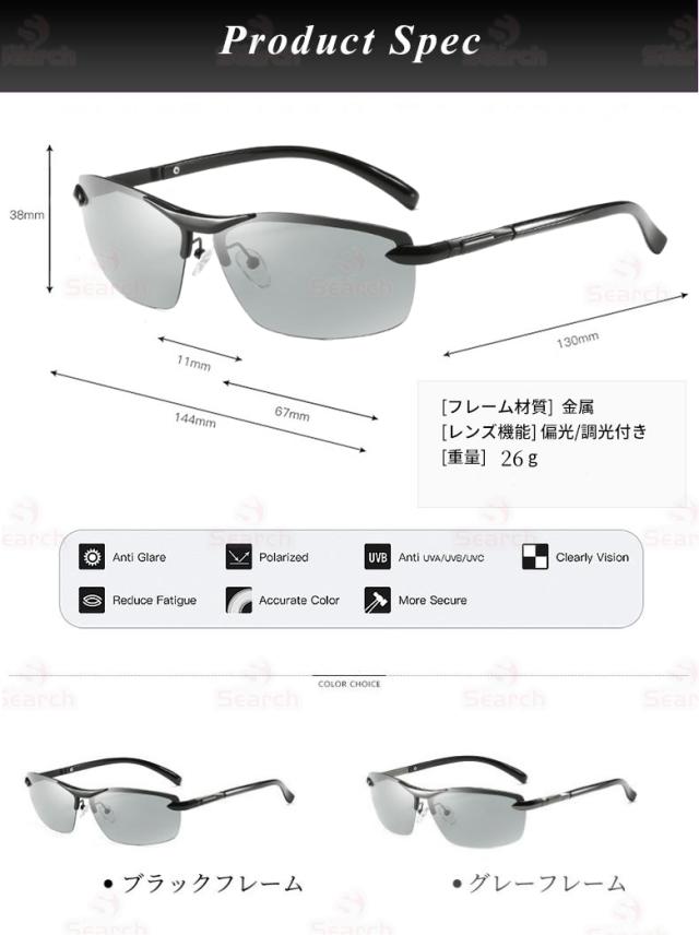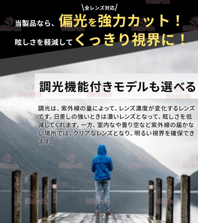 ■【調光偏光、便利な機能!】調光レンズは、紫外線濃度に応じてレンズの色が変わるハイテクレンズです。室内ではレンズ濃度が薄いため、視認性が良く、日差しが強いところでは、レンズ濃度が濃くなり、眩しさをカットしてくれます。