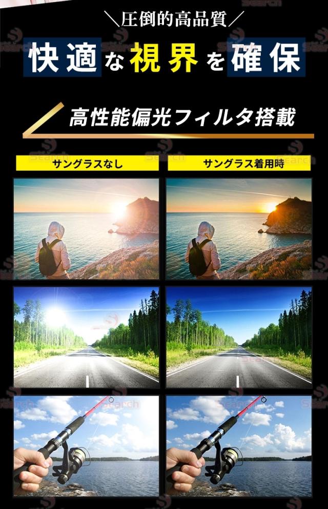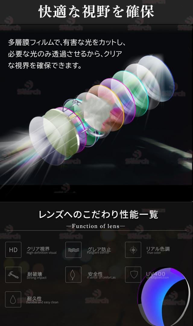 ■【高品質偏光レンズを採用!】光の反射やぎらつきを極限までカットしながら視界をくっきり見せる多層構造レンズを採用。海や川などの反射光をカットするから、ぎらつきがなくなり、釣りにも車の運転にも最適。