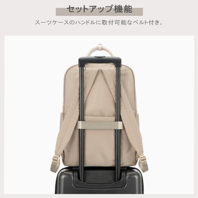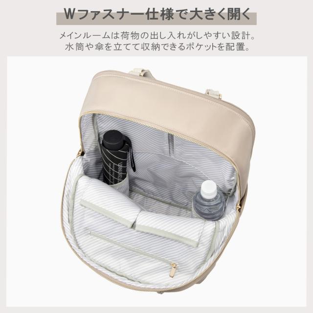 | ノートPCの持ち運びに最適な、優秀お仕事バッグシリーズ 「ラポルテム」 テレワークと出社を組み合わせたハイブリットワークに最適なリュックサックです。スーツスタイルやオフィスカジュアルスタイルに最適なすっきりとしたきれいめなデザイン。 15.6インチのノートPC、B4ファイルが入るサイズ感で、普段持ち歩く荷物が多い方にもおすすめの大容量タイプ。モバイル周辺機器やファイル類、ポーチ、お弁当箱など女性の通勤に必要なアイテムをしっかり収納可能です。メイン気室とPC収納気室は開閉しやすいダブルファスナー仕様です。 ●単独PC収納スペース15.6インチノートPC、B4ファイルが収納可能。クッション入りで、安心してノートパソコンを持ち運ぶことができます。PC収納部がメイン収納部から独立しているので、プライベートな荷物を周囲に見られることなくPCを取り出せます。 ※参考収納寸法 15.6インチノートPC:W38.5×H26.5×D2.7cm B4ファイル:38.0×27.3cm |