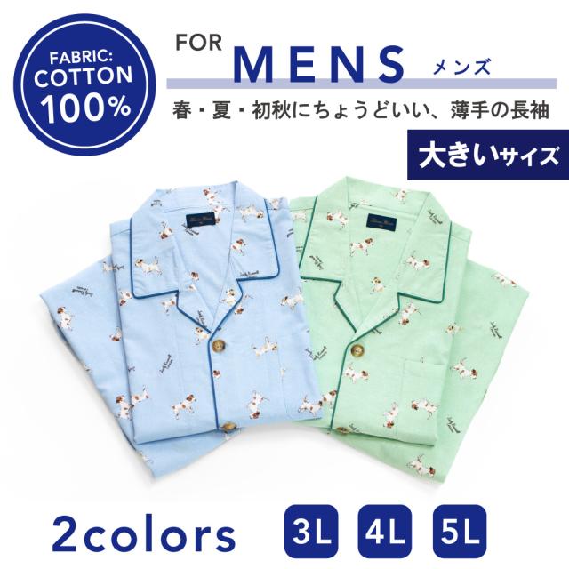 大きいサイズ パジャマ メンズ 綿100% 長袖 春 夏 初秋 前開き ボタン ジャックラッセルテリア 犬柄 薄手のシャツ ブルー グリーン 3L 4L 5L おそろい プレゼント 父の日