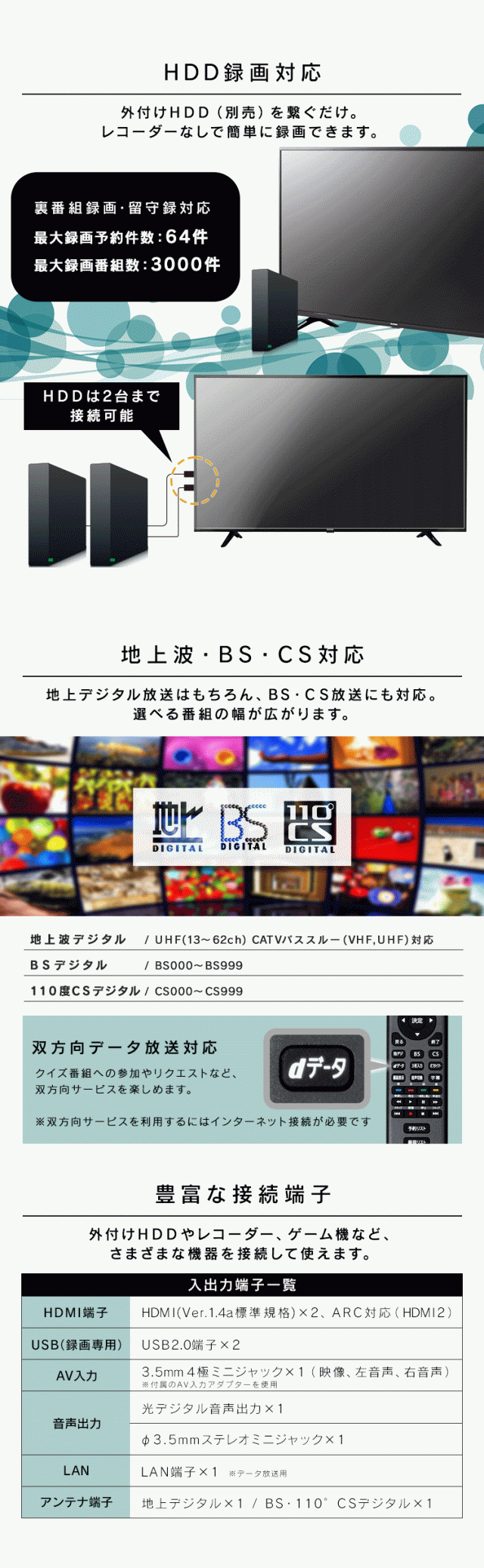 最大録画予約件数/最大録画番組数:64/3000