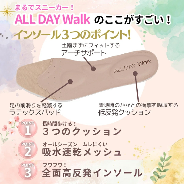 | 商品の特徴 | ▼▼▼ ご注意ください ▼▼▼ コチラの商品は2足セット販売です。必ず同じカート(1回のご注文)で2足以上お選びください。1足のみのご注文は請求金額から440円(税込み)加算致します。2足以上であれば何足でもOKです! また、セット販売限定の特別価格商品のため「お客様都合の返品とキャンセル」はお受けできません。サイズ交換に関わる費用はお客様ご負担にて承ります。あらかじめご了承の上、ご購入をご検討ください。 ■商品説明: ALL DAY Walk(オールデイウォーク)は20km歩けるパンプスを目標に開発されました。 度重なる災害で高まった、「非常時でも快適に歩けるパンプスを!」という働く女性たちのニーズから、“20km歩けるパンプス”を目標に、スニーカーのような履き心地のパンプスが誕生。 ●長時間歩ける。3つの柔らかなクッション 1. 着地時のかかとの衝撃を吸収する低反発クッション 2. 土踏まずにフィットするアーチサポート 3. 足の前滑りを軽減するラテックスパッド ●フワフワ。全面高反発インソール フワフワでへたりにくい厚みのある高反発素材を全面に使用しているため蹴り出し時の歩行の力をスムーズにアシスト。 ●オールシーズンムレにくい。吸水速乾メッシュ ムレやすいつま先部分には吸水性・速乾性のあるメッシュ素材を使用し水分を素早く吸収・拡散。スッキリ快適な履き心地。 ●お手入れかんたん。カップインソール インソールは取り外して陰干しができるから清潔感をキープ。 ●歩きやすさに配慮 柔らかい全面ラバー製のアウトソールはアキレスが設計するオリジナルモールドゴム底。 ●一体成型だから屈曲性と返りがよく底に溝を入れることで滑りに配慮されているのも嬉しい。 ![]() | |