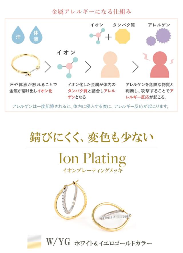 「 ステンレス 316L 」は、”錆びにくく変色も少ない”という特徴があります。そのため、汗などに接触しても金属が溶け出しにくく、アレルギー反応を起こしにくいので、近年金属アレルギー対応のジュエリー素材として使用されています。アレルギーの方でも安心・安全にオシャレを楽しんでいただきたいからこそ、素材にこだわりました。