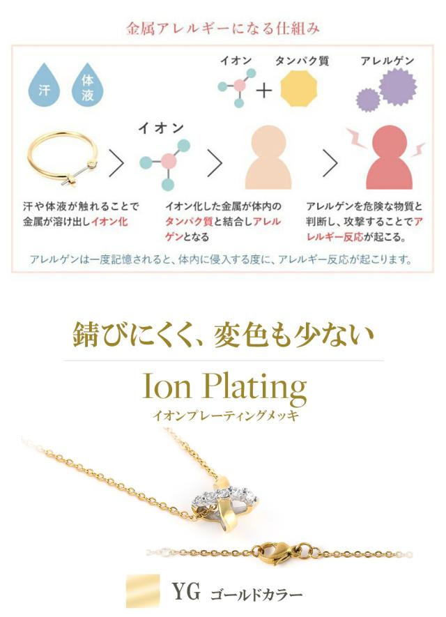 「 ステンレス 316L 」は、”錆びにくく変色も少ない”という特徴があります。そのため、汗などに接触しても金属が溶け出しにくく、アレルギー反応を起こしにくいので、近年金属アレルギー対応のジュエリー素材として使用されています。アレルギーの方でも安心・安全にオシャレを楽しんでいただきたいからこそ、素材にこだわりました。