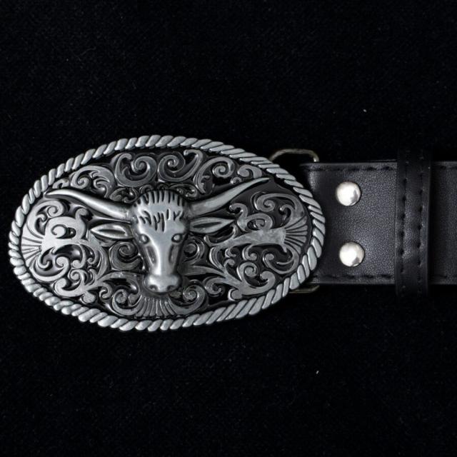 大きなバッファローバックルが特徴的で、しなやかなで厚みのある合成皮革を使用したデザインベルトです。