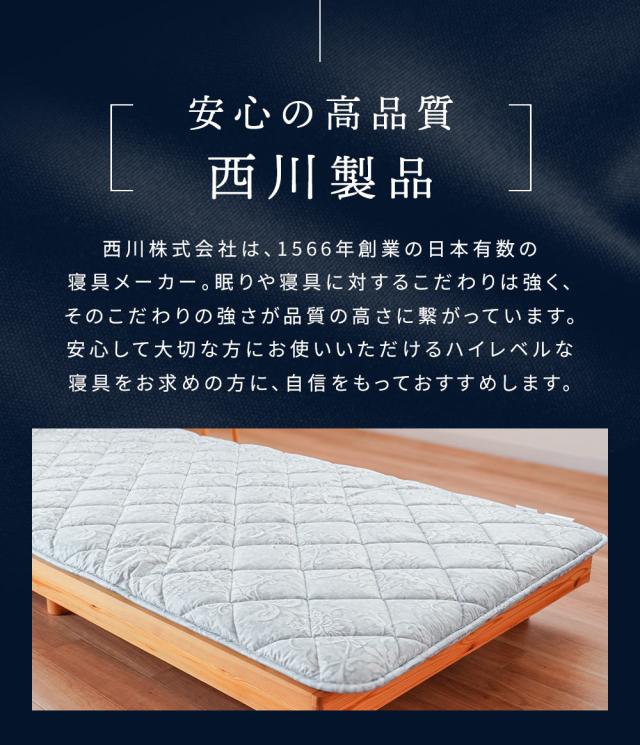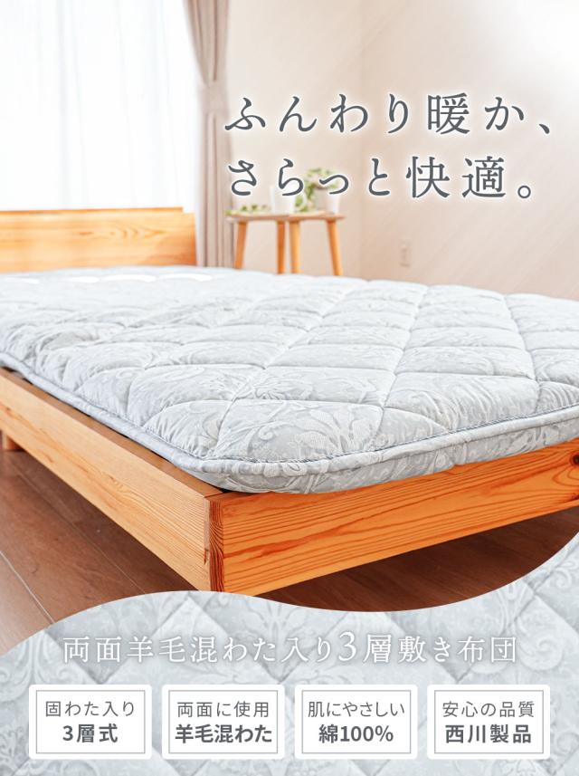 【再値下!】西川 敷布団 シングル ロング 羊毛混三層式固綿入り 敷き布団 合繊入り フランス ウール入り 綿100%生地 ダマスク柄 100×210
