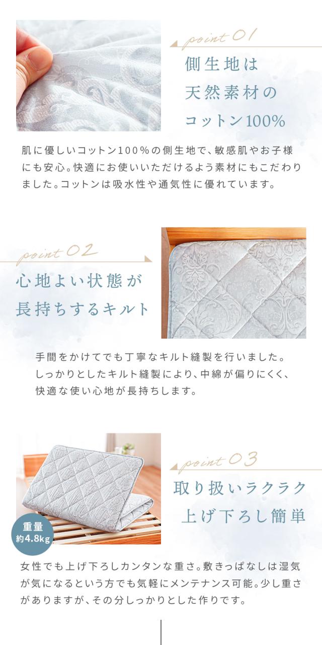 | ・固綿&両面羊毛混わた入り3層敷き布団について ほどよい硬さで体をしっかり支え、ほんのり暖かみと弾力性のある羊毛混わた入り。機能性に優れた羊毛を使用し、表裏とも羊毛混わたが入った3層構造で快適な寝心地を実現。普段使いはもちろん来客用にもおすすめです。 ・ウール入りだから弾力性や快適性アップ中わたに吸湿発散性に優れたウールを使用しているので、汗をかいてもムレにくく快適です。また弾力性が高く、やわらかな風合いで、しっかりと暖かさをキープします。 ・快眠の秘訣、しっかり固綿入り三層構造 しっかりめのフラットな固わたが入っているので、底付き感はあまり感じません。ポリエステル固綿を羊毛50%混の中綿で包んだ三層構造で体を支えます。 肌に優しいコットン100%の側生地で、敏感肌やお子様にも安心。快適にお使いいただけるよう素材にもこだわりました。コットンは吸水性や通気性に優れています。 ・心地良い状態が長続きするキルト手間をかけてでも丁寧なキルト縫製を行いました。しっかりとしたキルト縫製により、中綿が偏りにくく、快適な使い心地が長持ちします。 ・取り扱いラクラク上げ下ろし簡単女性でも上げ下ろしカンタンな重さ。敷きっぱなしは湿気が気になるという方でも気軽にメンテナンス可能。少し重さがありますが、その分しっかりとした作りです。 ・安心の高品質、西川製品西川株式会社は、1566年創業の日本有数の寝具メーカー。眠りや寝具に対するこだわりは強く、そのこだわりの強さが品質の高さに繋がっています。 安心して大切な方にお使いいただけるハイレベルな寝具をお求めの方に、自信をもっておすすめします。 | |