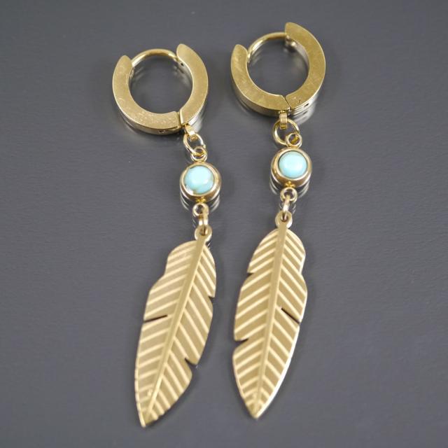 | サイズ | フェザーサイズ2.9mm×9mm/フェイクターコイズ直径5.8mm/ピアス直径13.3mm(内径8.8mm) ポスト太さ0.8mm 長さ7mm |