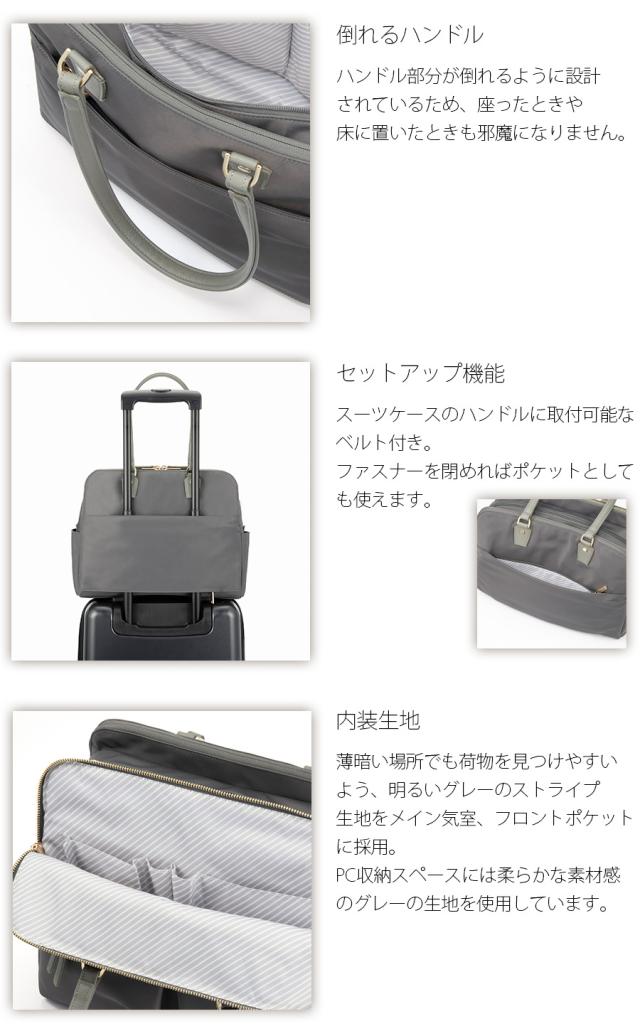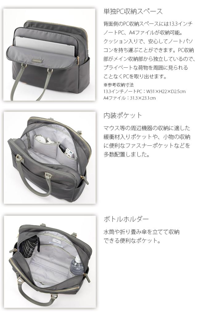 背面側のPC収納スペースには13.3インチノートPC、A4ファイルが収納可能。 クッション入りで、安心してノートパソコンを持ち運ぶことができます。 PC収納部がメイン収納部から独立しているので、プライベートな荷物を周囲に見られることなくPCを取り出せます。