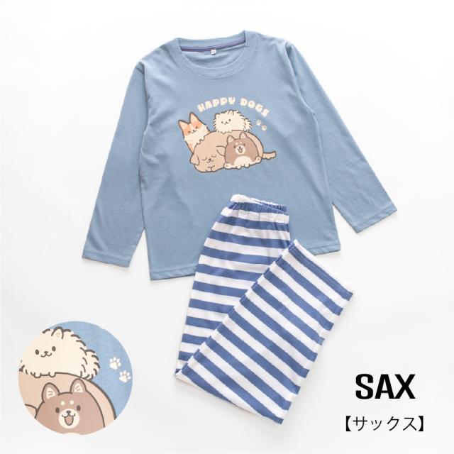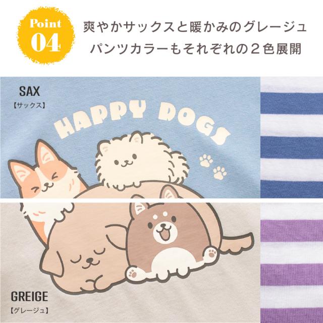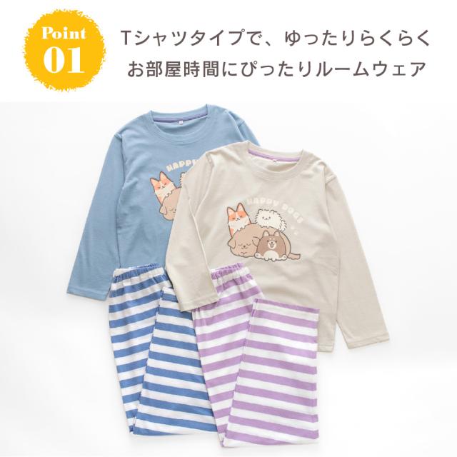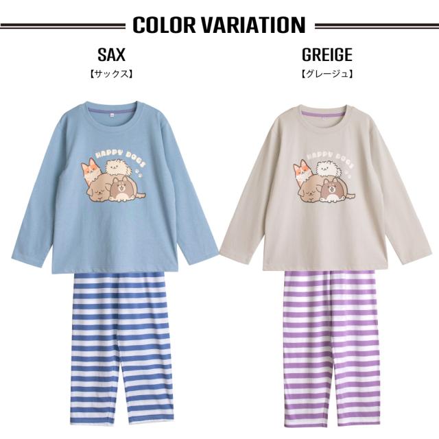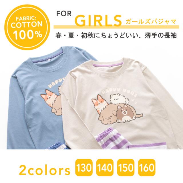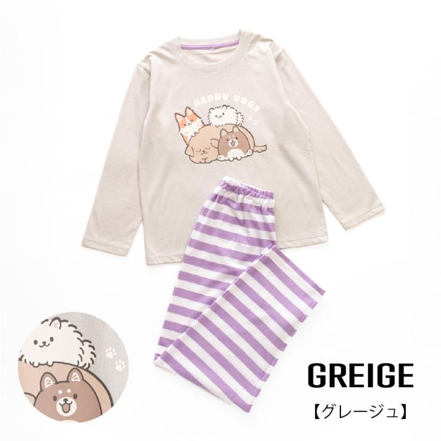 パジャマ キッズ 女の子 綿100% 長袖 春 夏 柔らかく軽い薄手の快適Tシャツ かわいい 犬プリント ボーダー長パンツ グレージュ ブルー 130 140 150 160 子供 ガールズ ジュニア 部屋着 ルームウェア メール便なら 送料無料