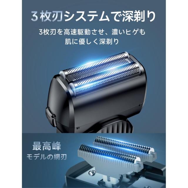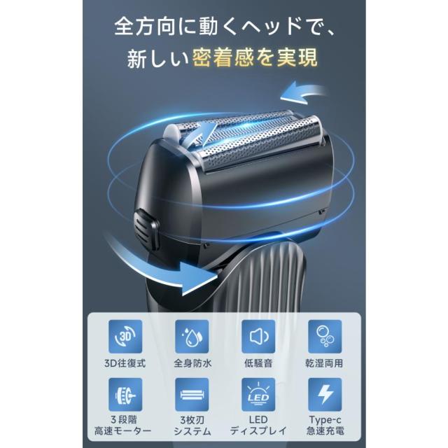 シェーバー メンズ 往復式 3枚刃 全身防水 乾湿両用 日本製 Type-c 急速 充電式 残量表示 ロック 低騒音 お風呂剃り可 髭 車内常備 ギフト