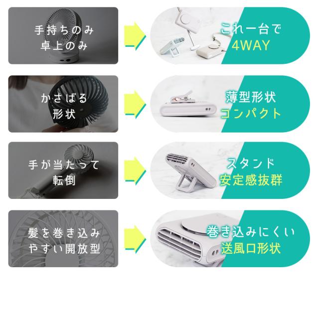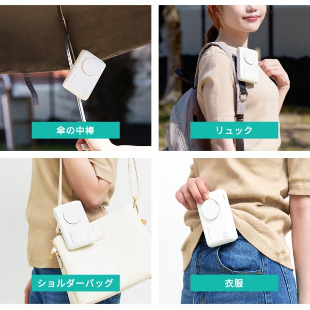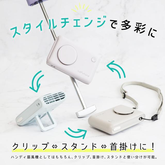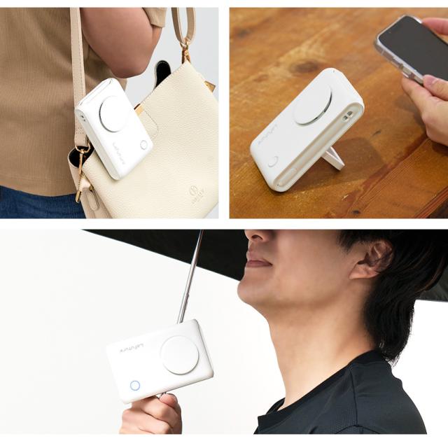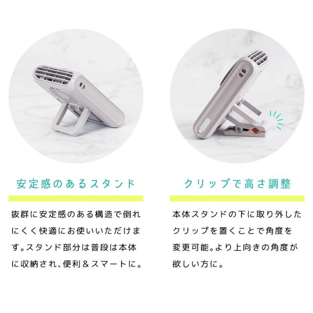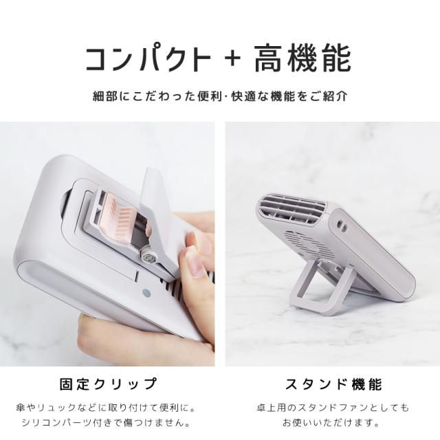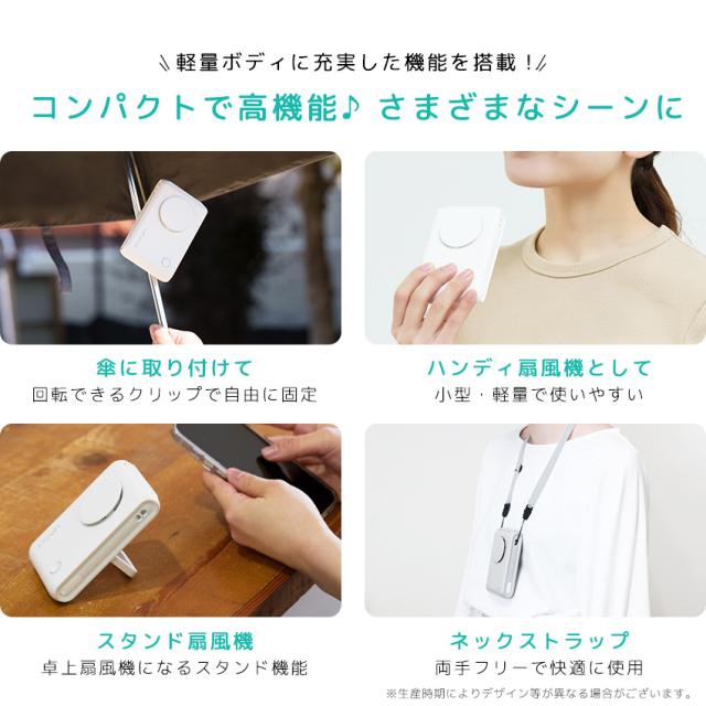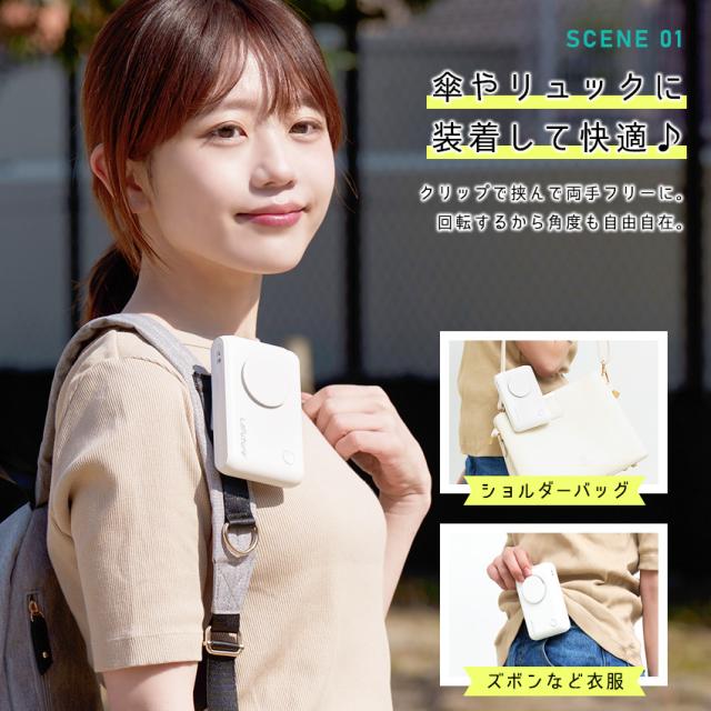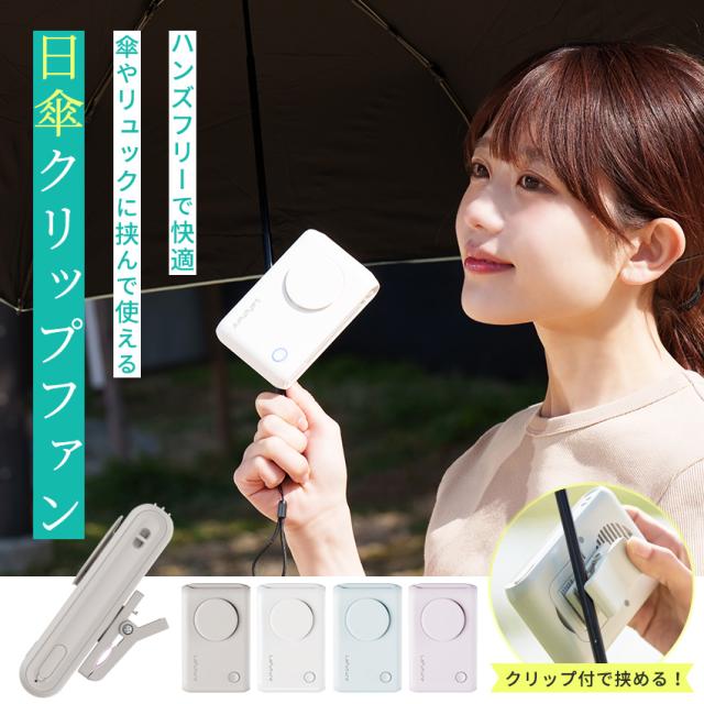 | ハンズフリーで快適。 傘やリュックに挟んで使える、日傘クリップファン! スタイルチェンジで多彩に4WAY! |