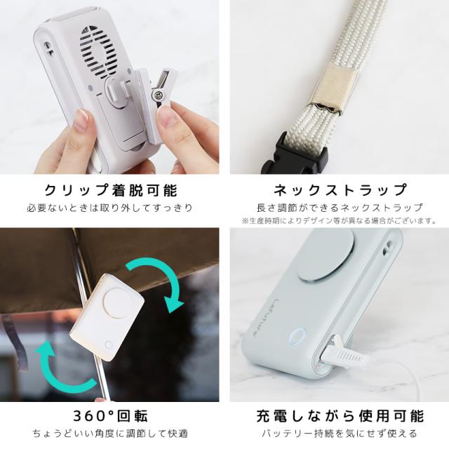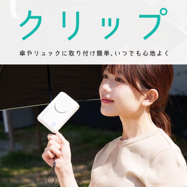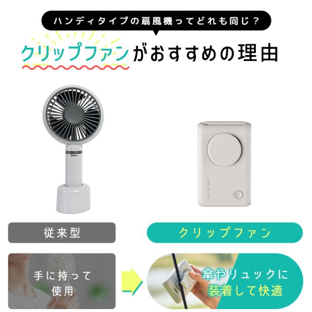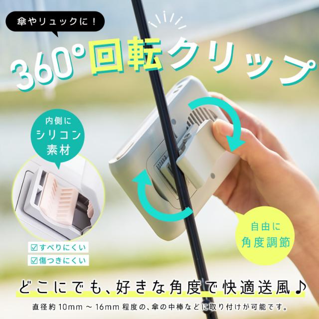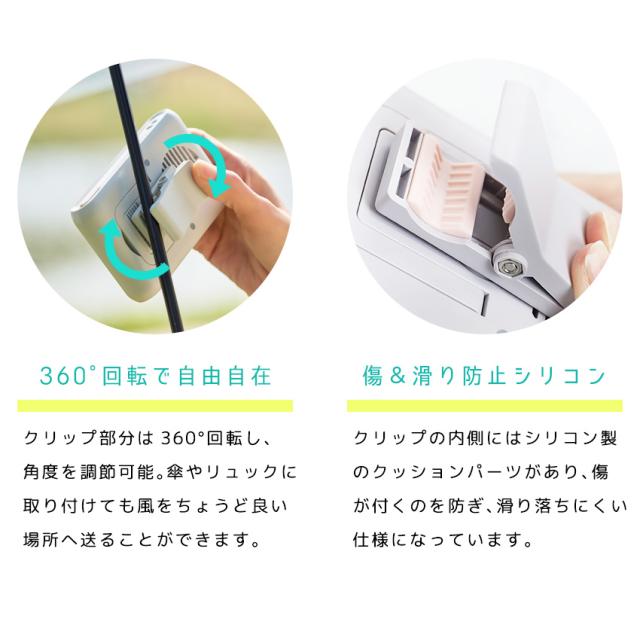 | 【クリップファン】 傘やリュックに装着して快適♪ クリップ部分は360°回転し、角度を調節可能。 傘やリュックに取り付けても風をちょうど良い場所へ送ることができます。 クリップの内側にはシリコン製のクッションパーツがあり、傷が付くのを防ぎ、滑り落ちにくい仕様になっています。 |