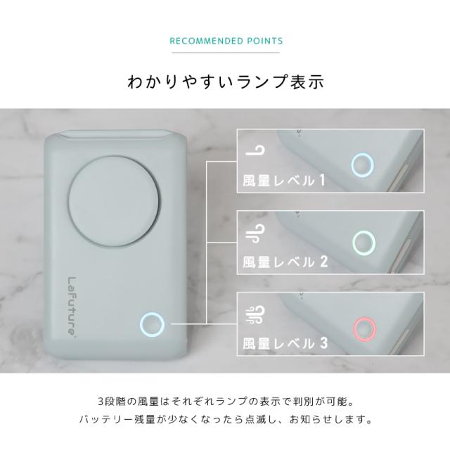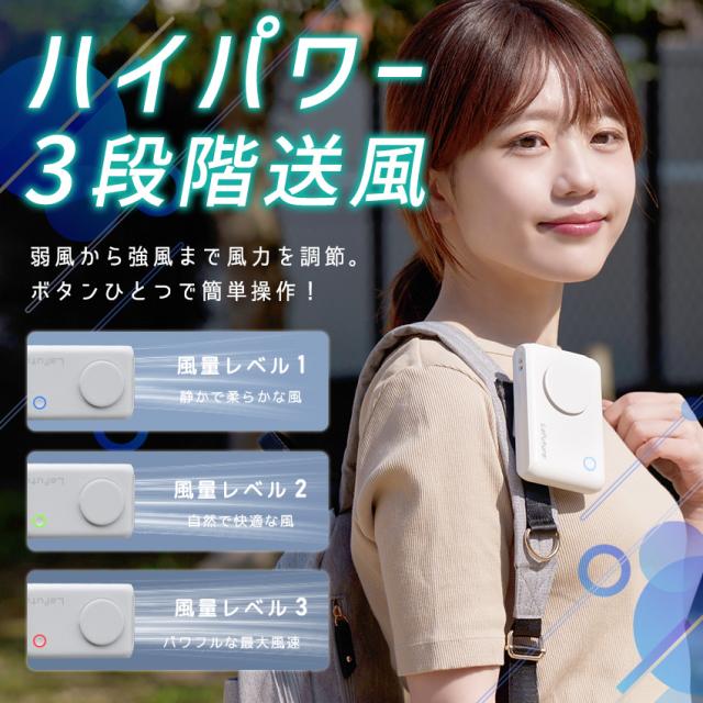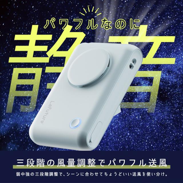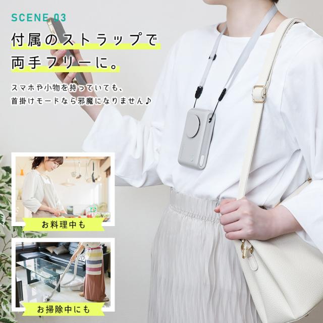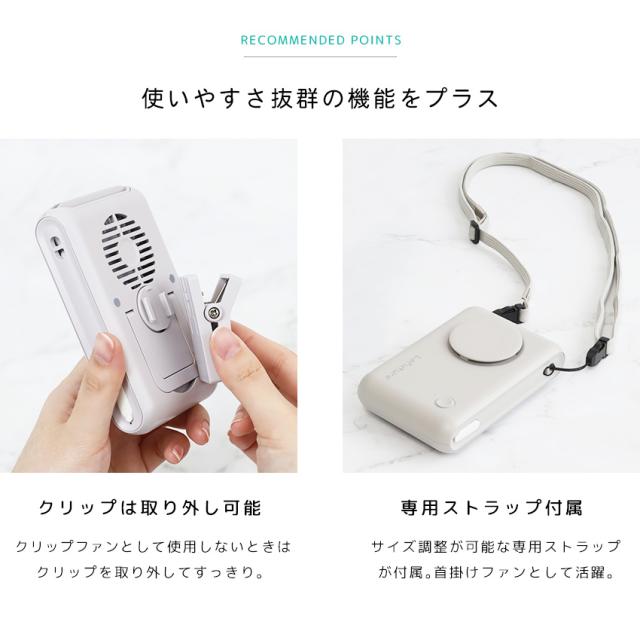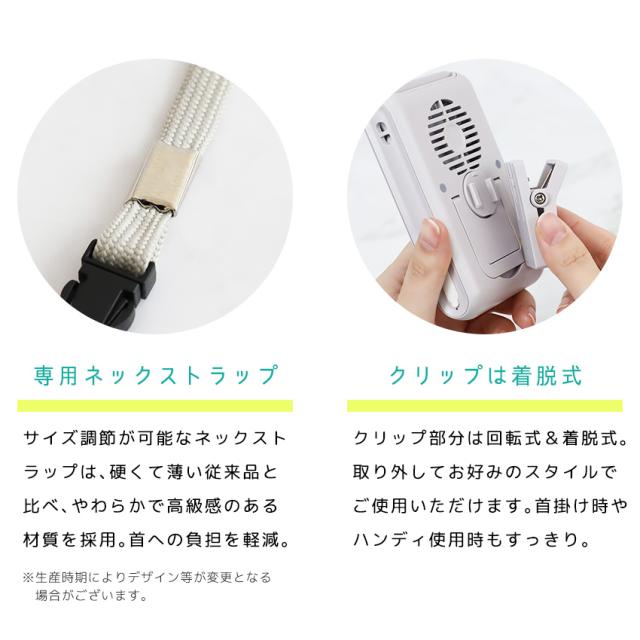| 【首掛けファン】 付属のストラップで両手フリーに。 サイズ調節が可能な付属の専用ネックストラップは、硬くて薄い従来品と比べ、やわらかで高級感のある材質を採用。 首への負担を軽減。クリップ部分は回転式&着脱式。 首掛け時やハンディ使用時もすっきり。 |