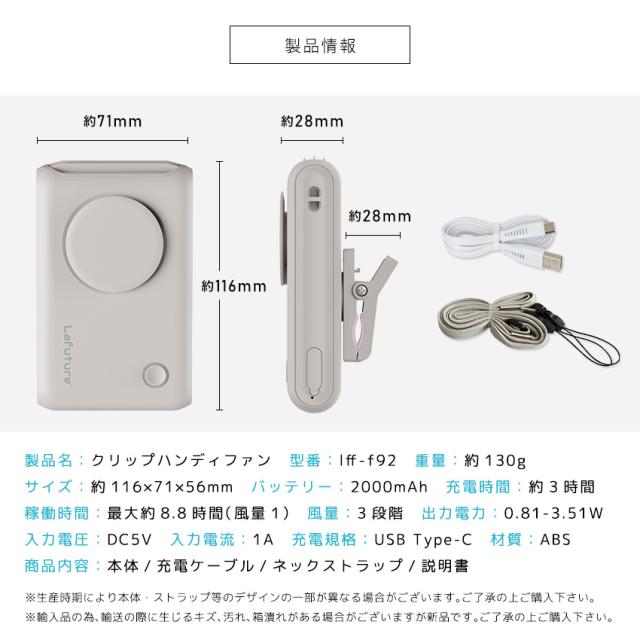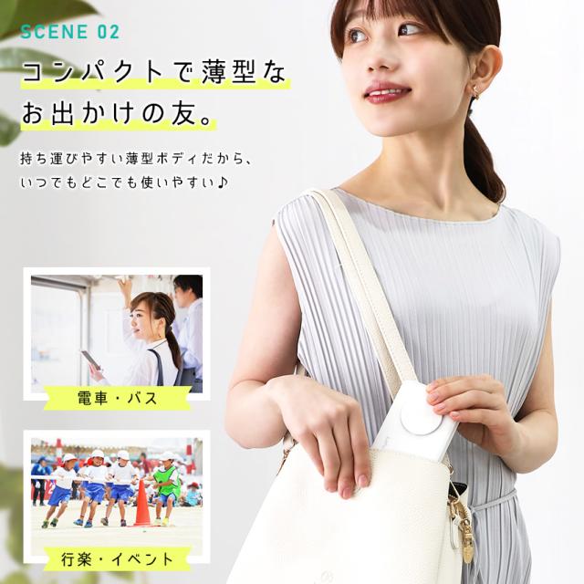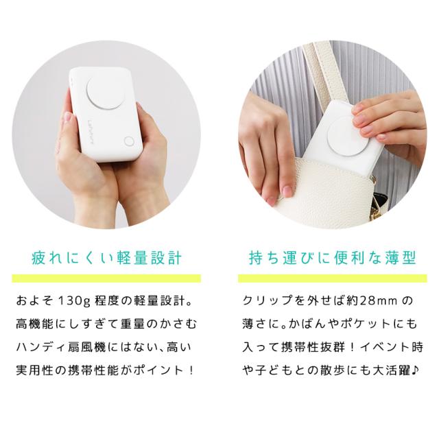 | 【ハンディファン】 コンパクトで薄型なお出かけの友。およそ130g程度の軽量設計。 高機能にしすぎて重量のかさむハンディ扇風機にはない、高い実用性の携帯性能がポイント! クリップを外せば約28mmの薄さに。 かばんやポケットにも入って携帯性抜群!イベント時や子どもとの散歩にも大活躍♪ |
