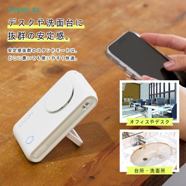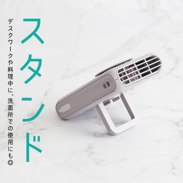 | 【スタンドファン】 デスクや洗面台に抜群の安定感。 抜群に安定感のある構造で倒れにくく快適にお使いいただけます。 スタンド部分は普段は本体に収納され、便利&スマートに。 本体スタンドの下に取り外したクリップを置くことで角度を変更可能。 より上向きの角度が欲しい方に。 |