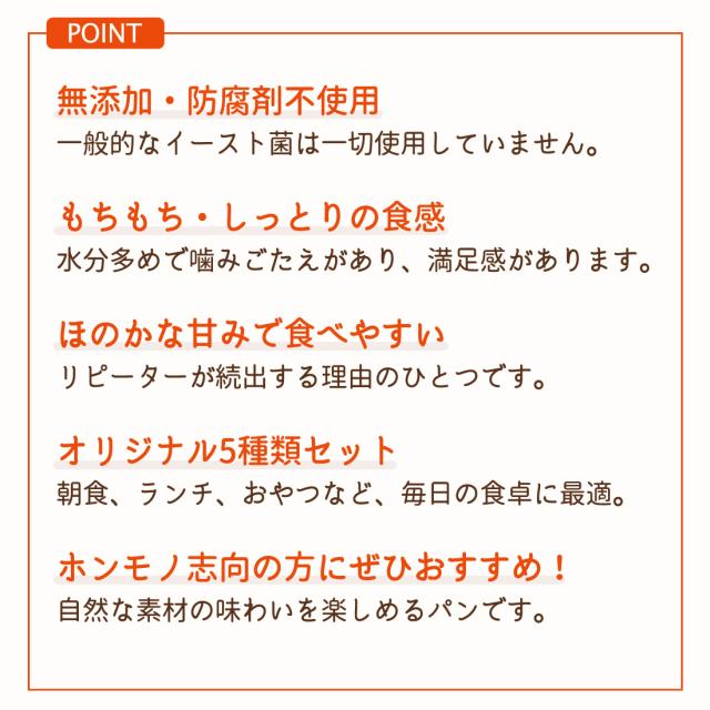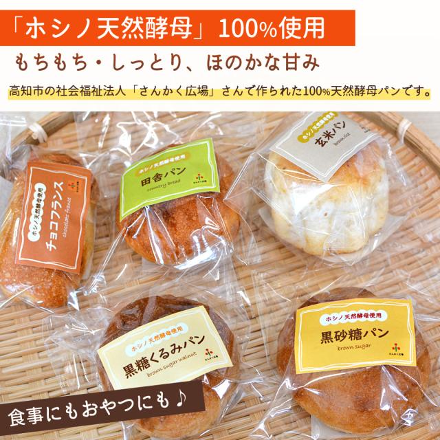 ホシノ天然酵母使用!自家製酵母パンの詰め合わせ 【オリジナル!天然酵母100%自家製パン】 天然酵母のみで発酵させた、さんかく広場オリジナル!「ホシノ天然酵母」100%の自家製パンです。天然酵母100%の生地を、24時間以上ゆっくり寝かせるオーバーナイト製法。酵母菌をじっくり醗酵させ、ひとつひとつ手づくりで丁寧に仕上げた本格自家製天然酵母パンです。 イースト菌は入れておりませんので、消化も良くお子様でも安心してお食べいただけます。もっちりとした食感や、天然酵母ならではの独特な風味と酸味をお楽しみください♪ 【もちもち・しっとり、ほのかな甘み、ホシノ天然酵母100%】 こちらの商品は、高知市にございます社会福祉法人「さんかく広場」さんの100%天然酵母パンです。 「ホンモノ志向」を追求する方にお勧め!「100%ホシノ天然酵母菌」で醗酵させた天然酵母パンは、もちもち・しっとり、ほのかな甘みでリピーターさんが続出!もちろん防腐剤・保存料なしの無添加!一般にイースト菌と呼ばれるものは一切使用しておりません。 水分多めでもちっとした食感!ずっしりとした重みと食べごたえのある5種類のオリジナルセットです。 毎日の朝食、ランチ、おやつに最適!是非おすすめいたします。 【ホシノ天然酵母100%自家製パンを当日出荷しております】 商品は、製造日の当日出荷しております。 天然酵母パンは、イーストパンと比較してやや日持ちが長いとされておりますが、防腐剤は一切使用しておりませんので賞味期限は製造日(出荷日)を含めて4日となっております。 到着後はすみやかにお召し上がりいただくか「冷凍保存」をお願いいたします。 なお、一度冷凍保存したパンは、召し上がる前に常温で約2時間ほど解凍したあと、先にレンジで約20〜30秒ほど温めてから、余熱したオーブントースターで表面がカリッとするくらい軽く焼くと作りたての風味がお楽しみいただけます。 <セット内容> [Aセット] 5種類のパン各2個入、合計10個 [Bセット] 3種類合計10個(玄米パン4個、田舎パン3個、黒砂糖3個) [Cセット] 2種類合計10個(玄米パン5個、田舎パン5個) [Dセット] 2種類合計10個(玄米パン5個、黒砂糖5個) [E] 玄米パン10個 [F] 田舎パン10個 [G] 黒砂糖10個 [H] 黒糖くるみ10個 [I] チョコフランス10個 ■玄米パン 玄米の香ばしい風味が広がる、しっとりとした生地。 軽くてソフトな食感にほんのり優しい甘さが加わり、食べやすい味わいです。 ■田舎パン 小麦粉と天然酵母だけで作った、素朴でやさしい味わい。 酵母パンならではのソフトでモチモチとした食感が魅力です。 毎日の食事に馴染む、シンプルなおいしさ。 ■黒砂糖 黒糖の優しい香りが広がる、シンプルな甘さ。 生地の密度が高く、噛むほどに感じる"みっちり"とした新食感。 ■黒糖くるみ 黒糖の優しい甘さと香ばしいくるみがたっぷり。 ほどよい弾力があり、食べ応え抜群。 おやつにもおすすめです。 ■チョコフランス ハードめの生地に、甘さ控えめのチョコを包んで焼き上げました。 温めると、トロッとしたチョコソースがあふれだします。朝食やおやつにぴったり♪ <原材料> ・玄米パン 小麦粉(国内製造)、加工玄米(玄米、砂糖)、牛乳、砂糖、植物性油脂、ホシノ天然酵母、食塩、(一部に小麦、大豆、乳成分を含む)/クエン酸、乳化剤、香料、アナトー色素 栄養成分表示(1個当たり):エネルギー244kcal、たんぱく質5.4g、脂質4.8g、炭水化物45g、食塩相当量0.5g ・田舎パン 小麦粉(国内製造)、ホシノ天然酵母(小麦を含む)、食塩 栄養成分表示(1個当たり):エネルギー116kcal、たんぱく質3.5g、脂質0.9g、炭水化物23.6g、食塩相当量0.46g ・黒砂糖 小麦粉(国内製造)、黒砂糖、ホシノ天然酵母、食塩、(一部に小麦を含む) 栄養成分表示(1個当たり):エネルギー267kcal、たんぱく質7.1g、脂質1.9g、炭水化物55.5g、食塩相当量0.9g ・黒糖くるみ 小麦粉(国内製造)、黒砂糖、くるみ、ホシノ天然酵母、食塩、(一部に小麦を含む) 栄養成分表示(1個当たり):エネルギー302kcal、たんぱく質7.5g、脂質7.9g、炭水化物50.4g、食塩相当量0.79g ・チョコフランス 小麦粉(国内製造)、チョコチップ、ホシノ天然酵母、食塩、アーモンドスライス/乳化剤、香料 栄養成分表示(1個当たり):エネルギー195kcal、たんぱく質4.6g、脂質4.3g、炭水化物34.6g、食塩相当量0.5g ■生産地:高知県高知市 ■内容量:計10個(セット内容をお選びできます) ■賞味期限:製造日から4日 ■保存方法:直射日光、高温多湿を避けて保存してください。 <出荷につきまして> 出荷までの日数:3〜8営業日 ・本商品は、パン工場で毎週火曜日に焼き上げたものを当店に当日配達し、その日の午後に出荷しております。 常温で発送いたします。 ・イースト菌は使っておりません。ホシノ天然酵母菌のみを使ってゆっくりと寝かせて発酵させております。 ・ごくまれに、自然環境などが理由で発酵に時間がかかり膨らみが不足するなどで予定通り焼けない場合がございます。その場合は、ご連絡のうえ後日ご発送させていただくこ