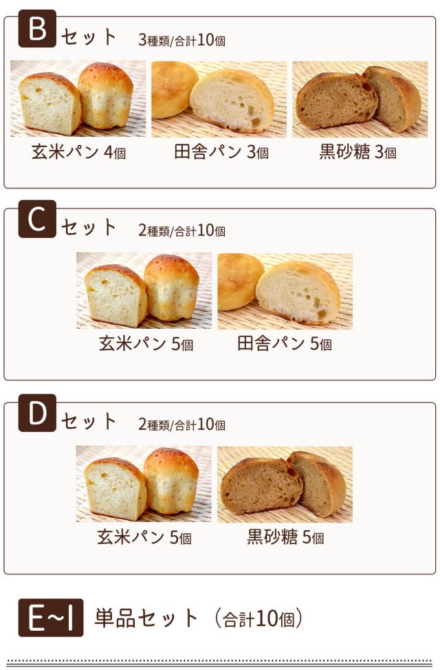 3種類合計10個(玄米パン4個、田舎パン3個、黒砂糖3個)