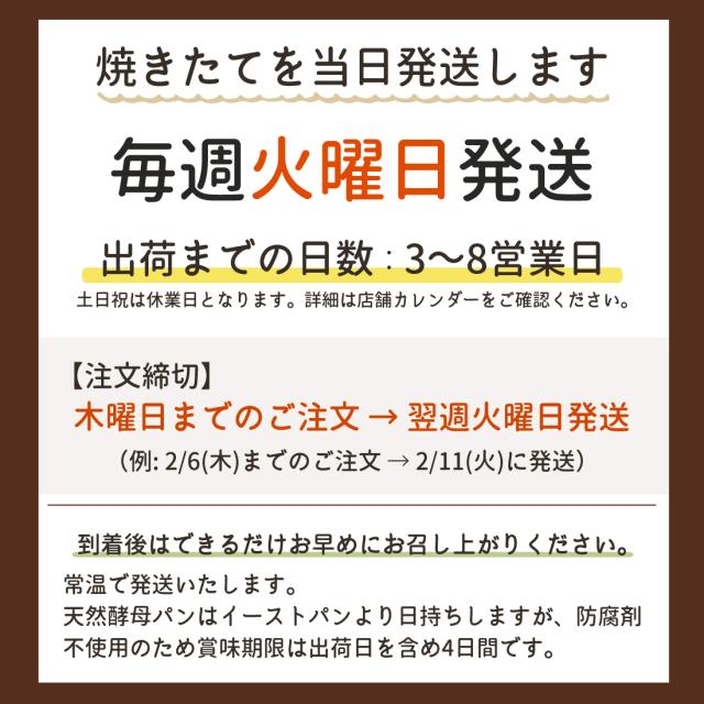 ・本商品は、パン工場で毎週火曜日に焼き上げたものを当店に当日配達し、その日の午後に出荷しております。