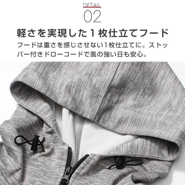 【程良い伸びでスムーズな動きを実現】 ストレッチの効いたジャージ素材で伸縮し、スムーズな動きが実現。 洗濯も乾きやすい素材で便利。 【軽さを実現した1枚仕立てフード】 フードは重さを感じさせない1枚仕立てに。 ストッパー付きドローコードで風の強い日も安心。 【ファスナーが気にならないデザイン】 フラット面を表側にしたファスナー。 これにより、シャープなデザインに仕上がっています! 【ウェストゴムとドローコード】 程良いフィット感のゴム入りウェストに加えてドローコードでズレにくい。 【ファスナー付きバックポケット】 パンツのバックポケットは右側に。 こちらもしっかりファスナー付き。 |
