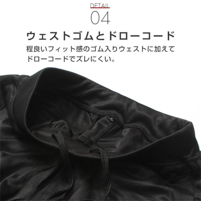 程良いフィット感のゴム入りウェストに加えてドローコードでズレにくい。
