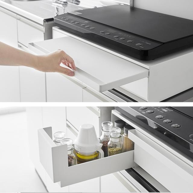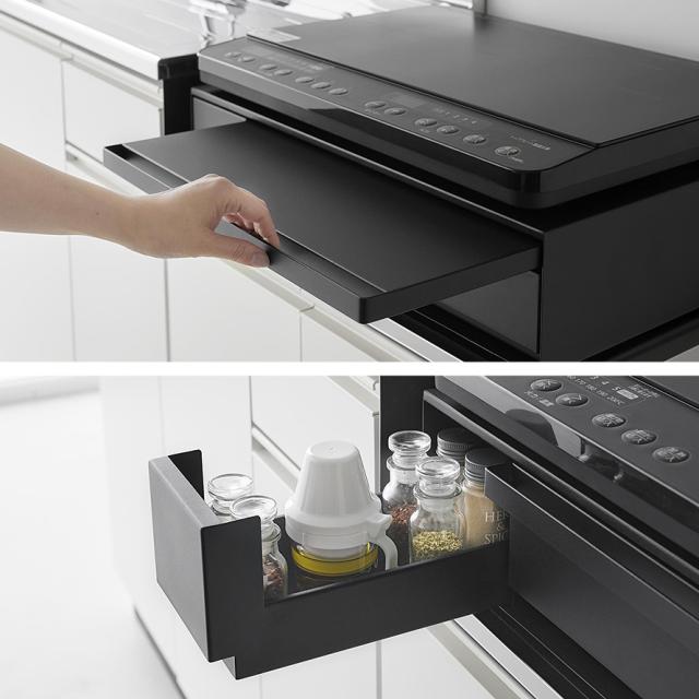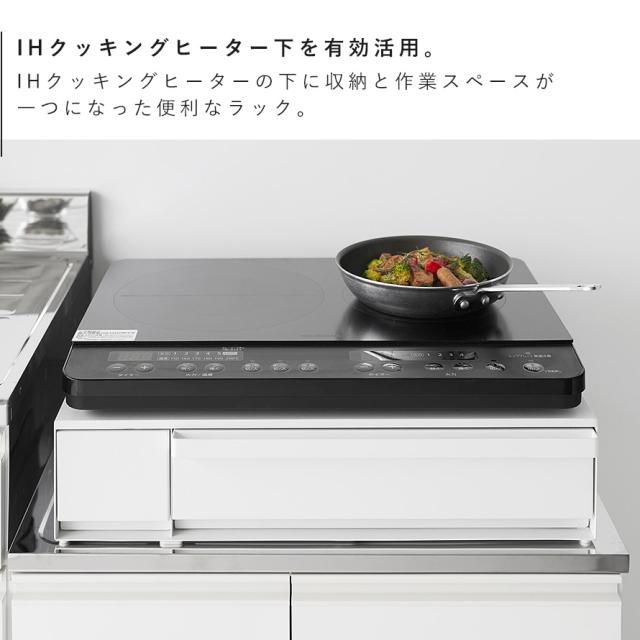 大小の引き出しとスライドテーブルが付いたIHクッキングヒーターラック。