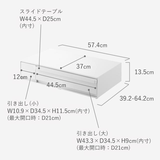 ■内寸サイズ:天板/幅57.4×奥行37cm スライドテーブル/幅44.5×奥行25cm 引き出し(大)/幅43.3×奥行34.5×高さ9cm(最大開口時/奥行21cm) 引き出し(小)/幅10.9×奥行34.5×高さ11.5cm(最大開口時/奥行21cm)
