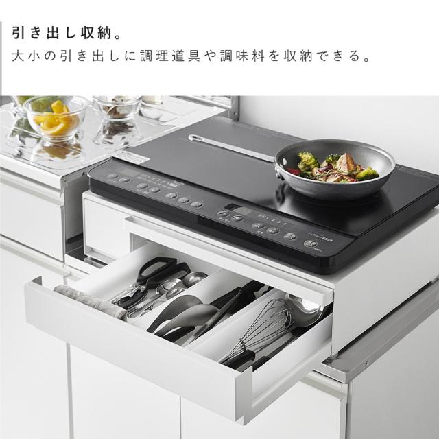 大きい引き出しは調理小物などの収納に、小さい引き出しには調味料などの収納におすすめ。