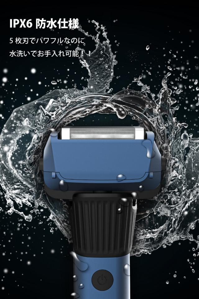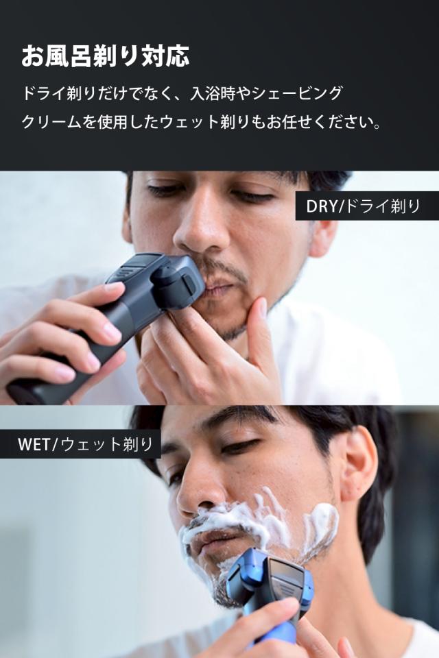 水洗いOKの防水仕様で、お風呂でも使用可能。シェービングフォームやジェルを使ったウェット剃りにも対応します。