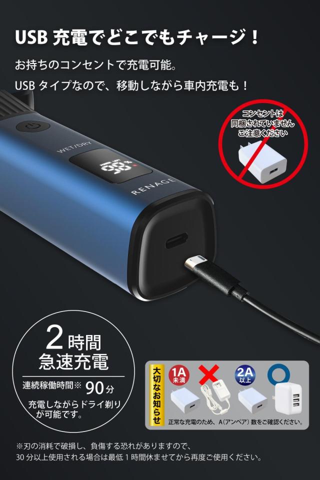 - このシェーバーは、USBタイプC充電式で、なんとわずか2時間でフル充電が可能!さらに、充電交流式にも対応しているため、充電しながらの使用も可能です。忙しい朝でも、バッテリー切れを気にすることなく、スム...