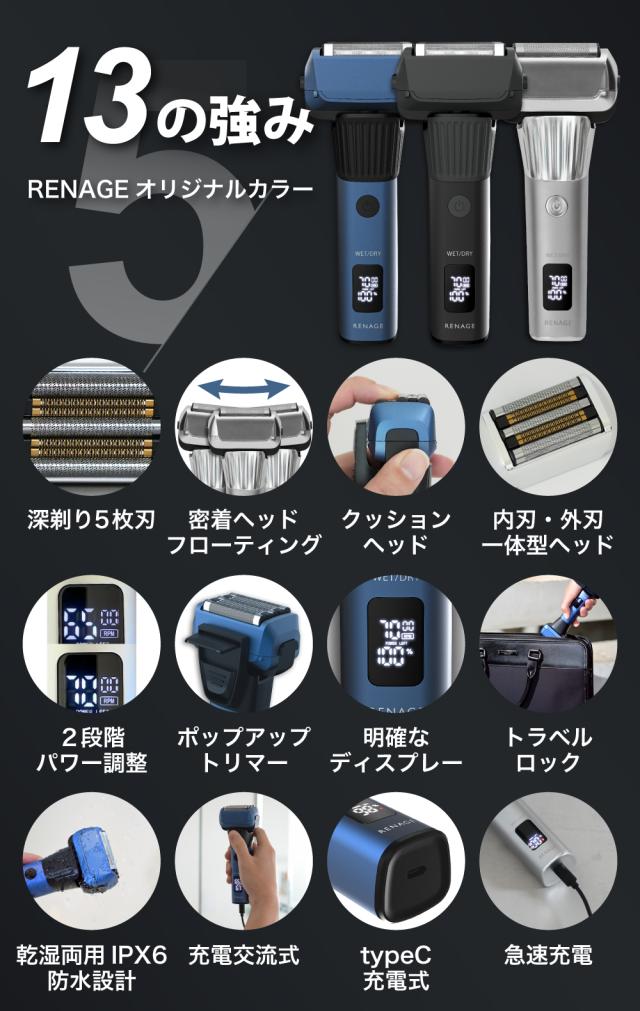 電気シェーバー 電動シェーバー 電動ひげそり 5枚刃 髭剃り もみあげ TypeC 急速充電 頬 自分磨き 清潔感 メンズ美容 メンズシェーバー 交流式 セルフケア 男性美容 フェイスケア 深剃り 肌にやさしい 頬 うなじ RENAGE