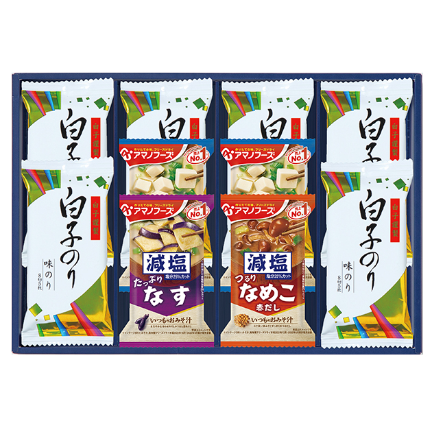 ●白子のり味のり(8切5枚入)×6、減塩いつものおみそ汁(なす)9g×1、減塩いつものおみそ汁(とうふ)10.3g×2、減塩いつものおみそ汁(なめこ)8g×1