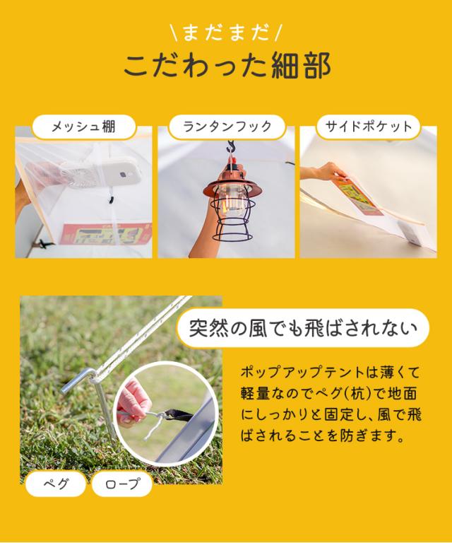| 内容 | テント本体 ロープ 4本 ペグ 6本 持ち手付き収納バッグ |