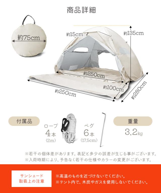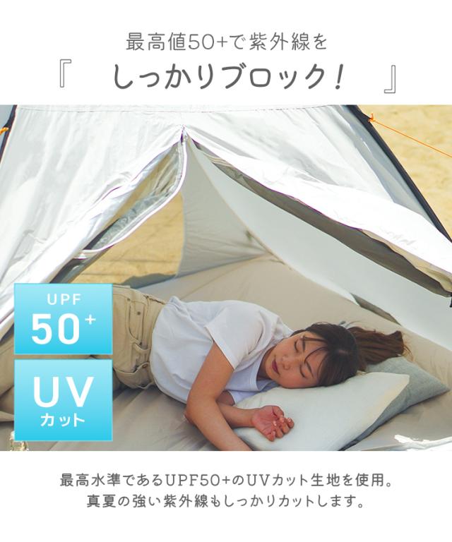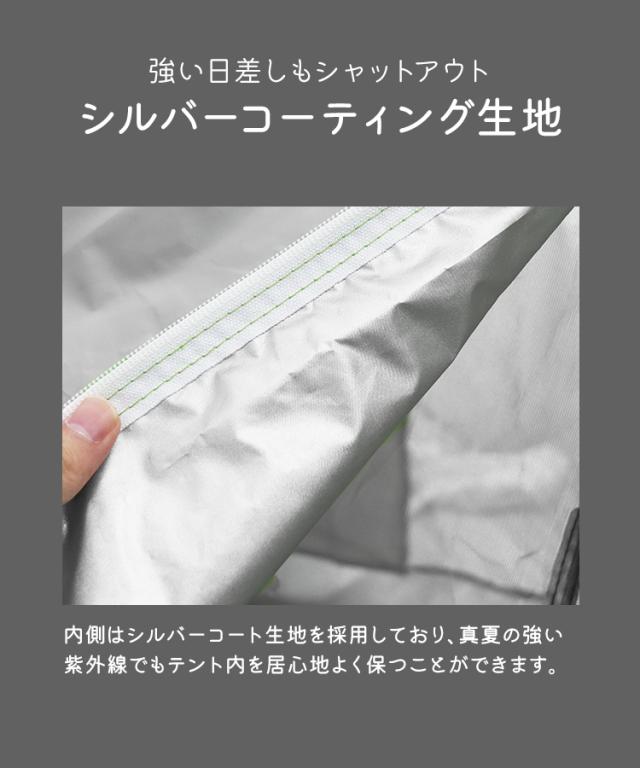 | 素材 | 190Tポリエステル (シルバーコーティングUPF50+) メッシュ:ポリエステル100% 天井フック:PP 日さしパイプ:D6.9mmグラスファイバーポール |