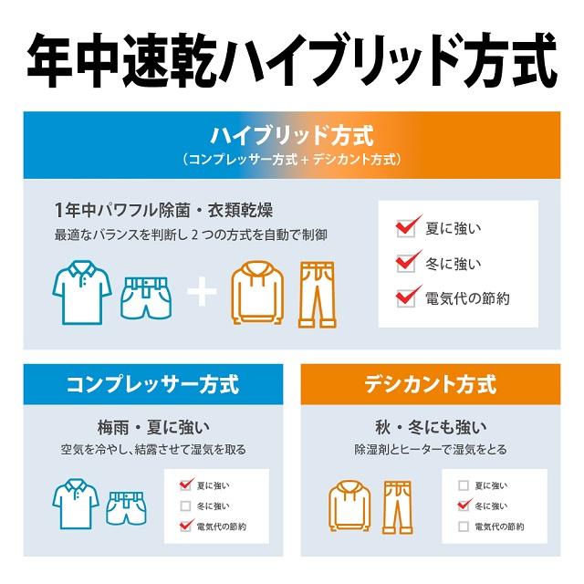 ※5 除湿機の衣類乾燥性能は一般社団法人日本電機工業会 自主基準(JEMA-HD090:2017)に基づき、以下の条件のもとで試験を行った値です。試験条件●部屋の広さ6畳相当●室温20℃(梅雨時)、10℃(冬季)、湿度70%、60Hz●洗濯物:2kg相当(Tシャツ3枚、Yシャツ2枚、パジャマ1組、下着7枚、靴下2足、タオル3枚)●運転モード:衣類乾燥「速乾」運転時。実使用時の衣類乾燥時間は使用環境・使用条件により異なります。