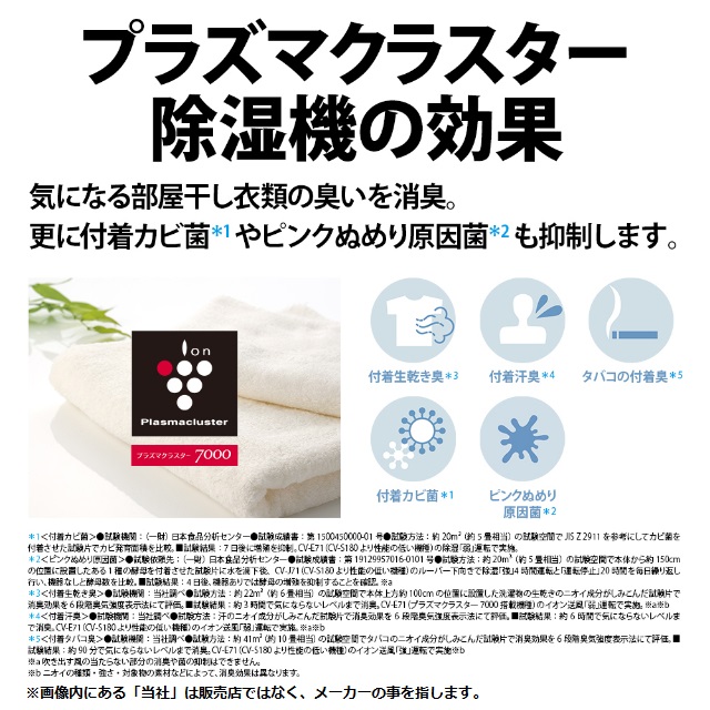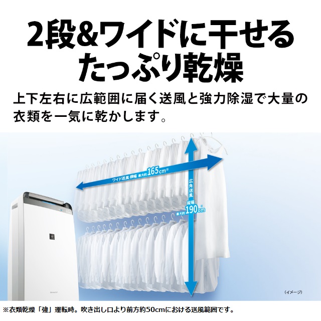 ※4 除湿機の衣類乾燥性能は一般社団法人日本電機工業会 自主基準(JEMA-HD090:2017)に基づき、以下の条件のもとで試験を行った値です。試験条件●部屋の広さ6畳相当●室温20℃、湿度70%、60Hz●洗濯物:2kg相当(Tシャツ3枚、Yシャツ2枚、パジャマ1組、下着7枚、靴下2足、タオル3枚)●製品位置:洗濯物の下方、外周近傍に設置●運転モード:衣類乾燥「強」運転時。実使用時の衣類乾燥時間は使用環境・使用条件により異なります。