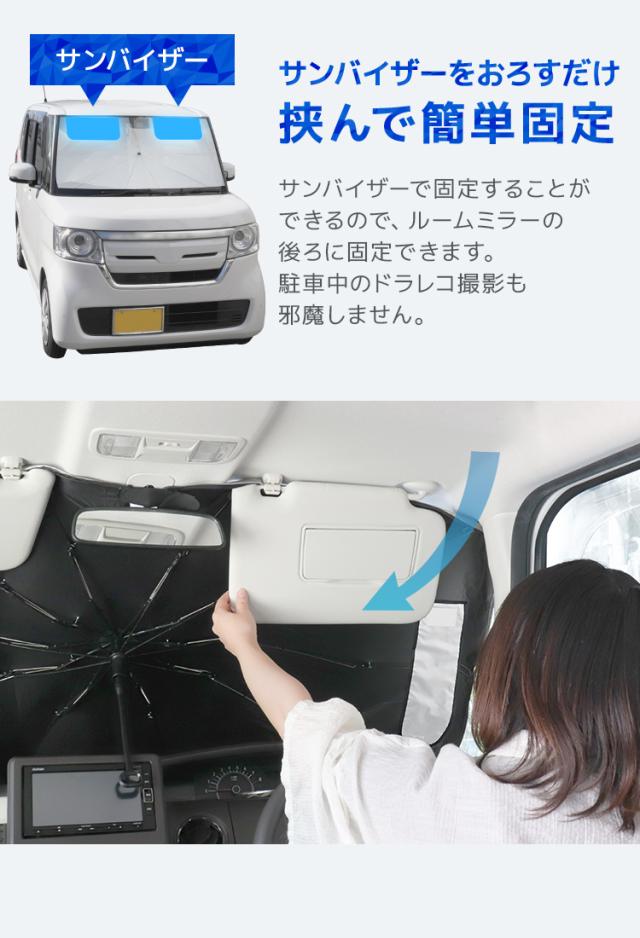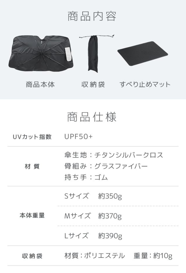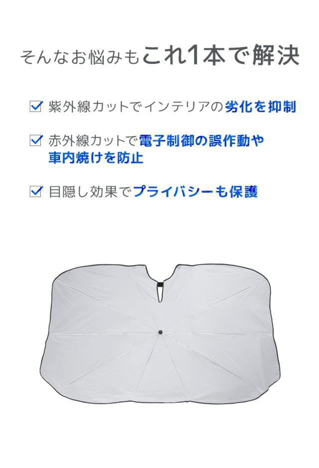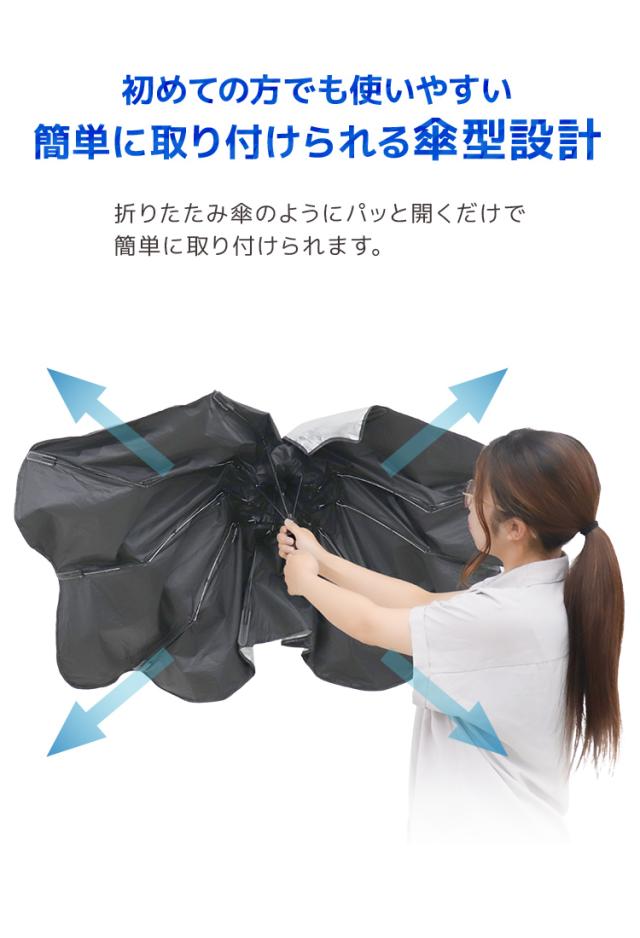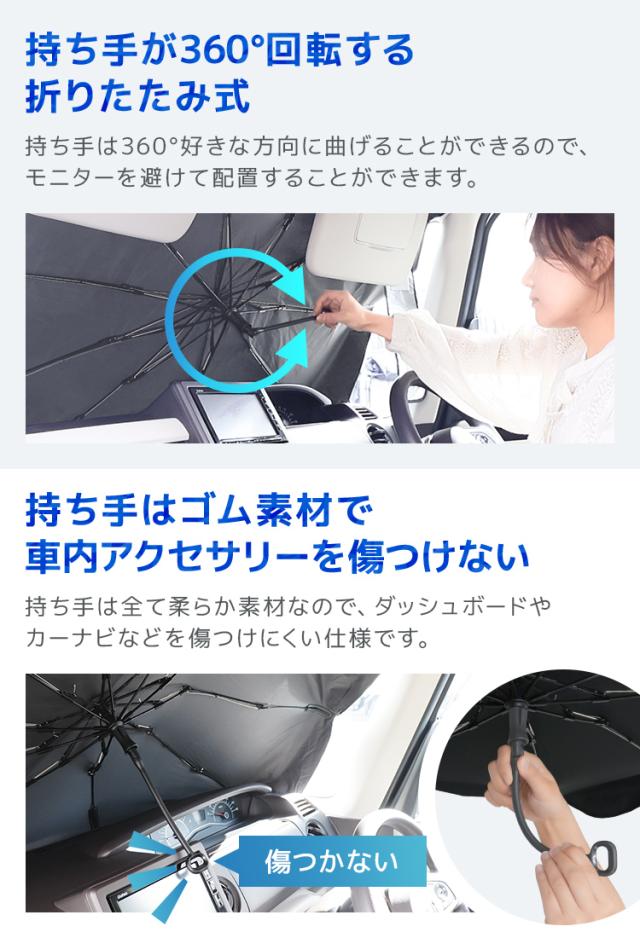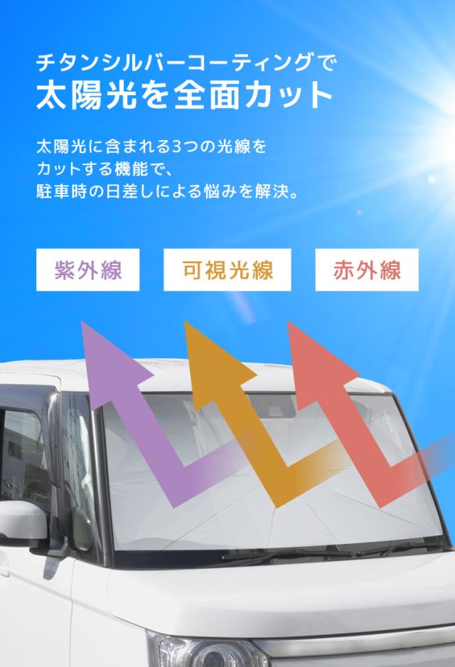 | 特徴 | 全面シルバーコーティング 紫外線・可視光線・赤外線カット 折りたたみ傘型 簡単収納 ゴム製シャフトで傷つかない ルームミラー部V字カット設計 軽量丈夫グラスファイバー10本骨 先端バネ仕様 PUレザー収納袋付き |