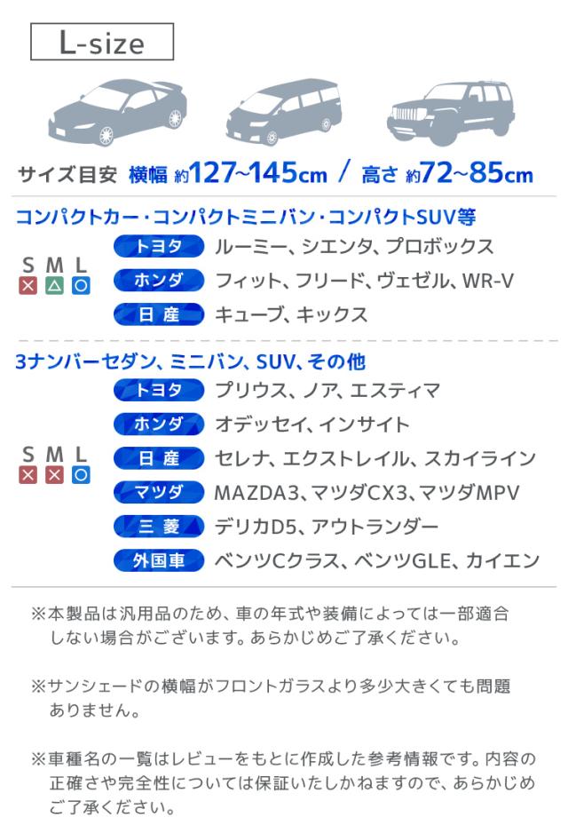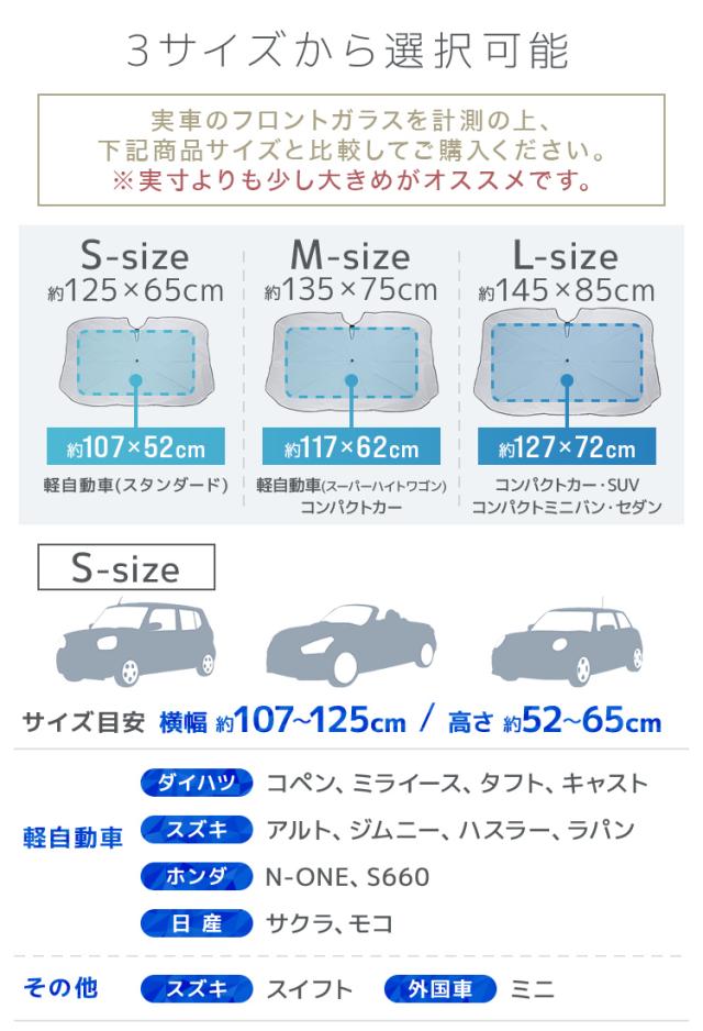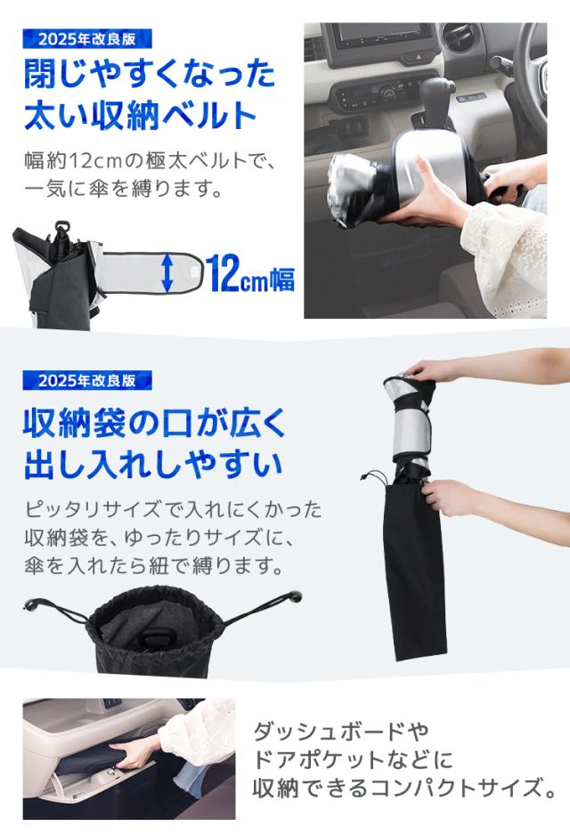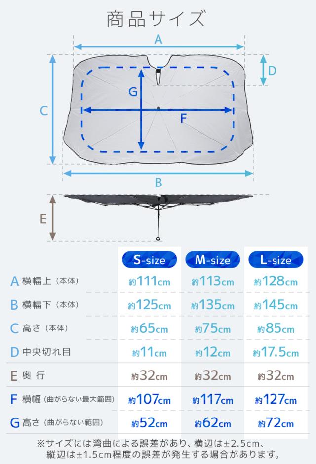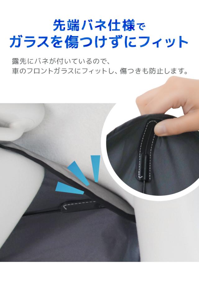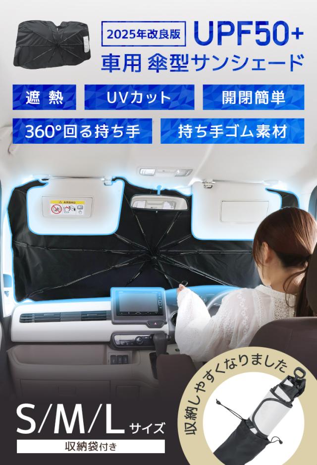 | 特徴 | 全面シルバーコーティング 紫外線・可視光線・赤外線カット 折りたたみ傘型 簡単収納 ゴム製シャフトで傷つかない ルームミラー部V字カット設計 軽量丈夫グラスファイバー10本骨 先端バネ仕様 PUレザー収納袋付き |