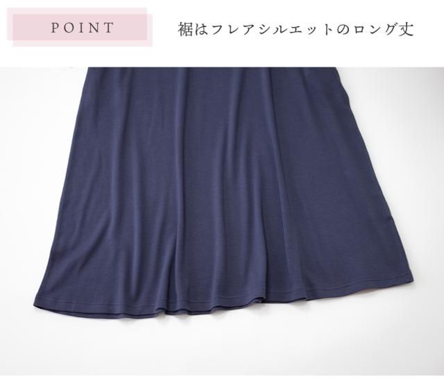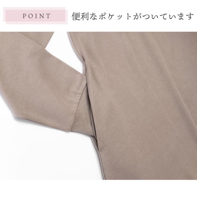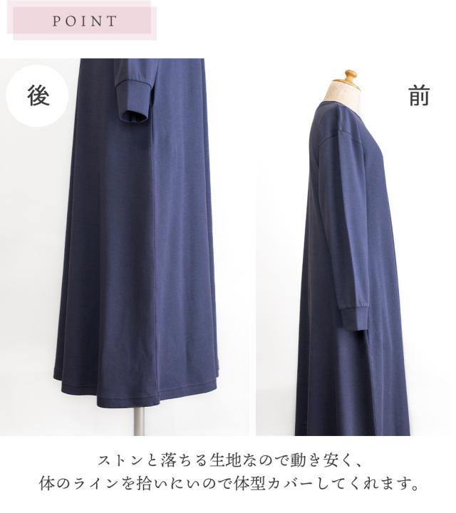 裾はフレアシルエットのロング丈ワンピースで、脇にはポケットがあるので使いやすいルームウェアです。 ストンと落ちる生地なので動き安く体のラインを拾いにいので体型カバーしてくれます。