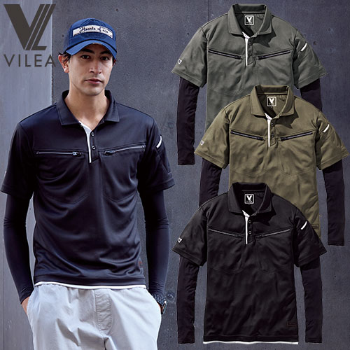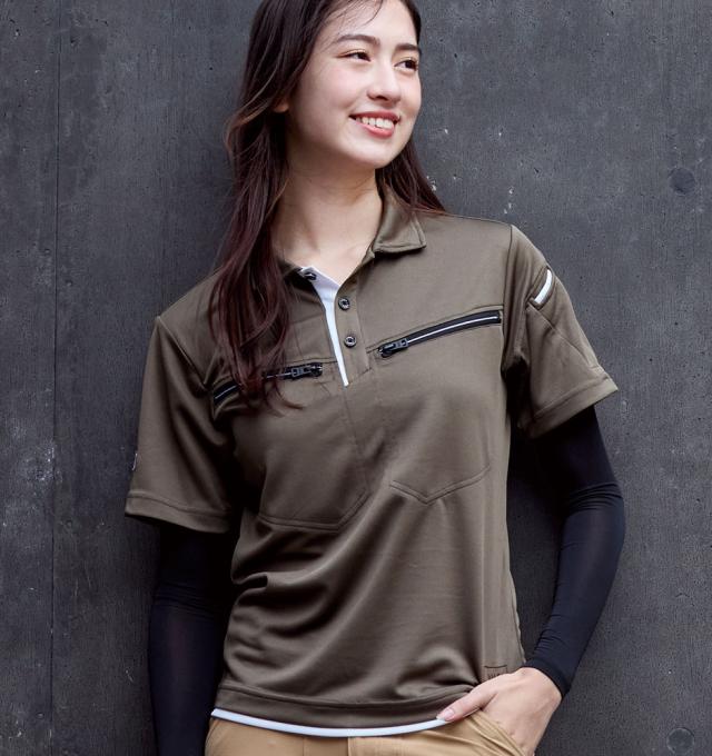 半袖ポロシャツ+アームカバーの夏定番スタイルが一発で完成する便利な一着。重ね着風レイヤードスタイルであらかじめアームカバーが袖にセットされており(取り外し不可)、わずらわしいアームカバーのずり落ちや紛失を防止します。