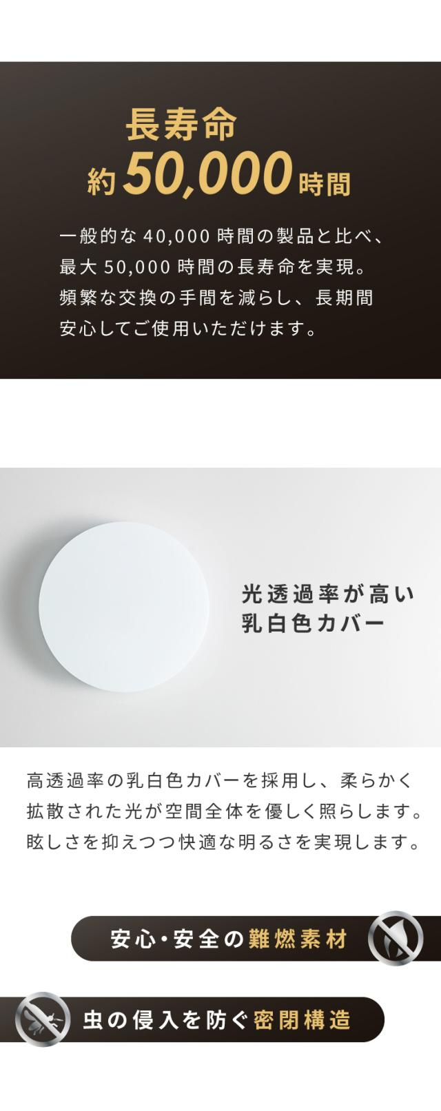 一般的な40,000時間の製品と比べ、最大50,000時間の長寿命を実現。頻繁な交換の手間を減らし、長期間安心してご使用いただけます。